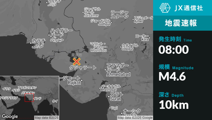 12月26日 08:00頃、インドのRāparから北西27kmの地点でM4.6の地震がありました。