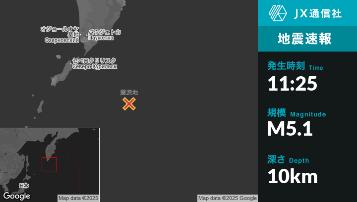 震源地ロシアのSevero-Kuril’skから東南東218kmの地点