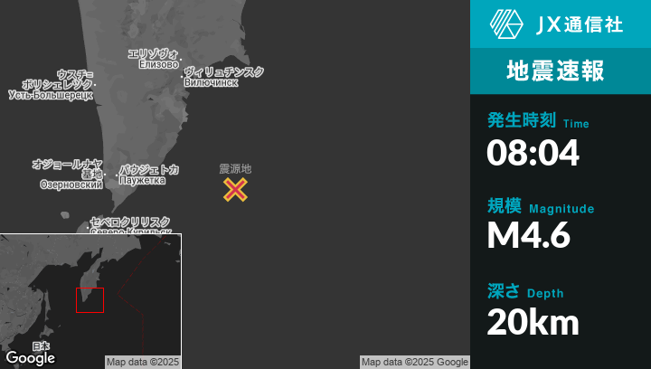 1月01日 08:04頃、ロシアのVilyuchinskから南南東199kmの地点でM4.6の地震がありました。