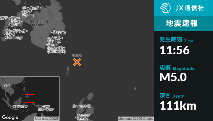 1月01日 11:56頃、フィリピンのPondaguitanから南東207kmの地点でM5.0の地震がありました。