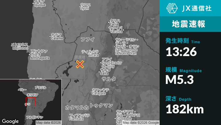 | 震源地 | アルゼンチンのSan Antonio de los Cobresから西47kmの地点 |