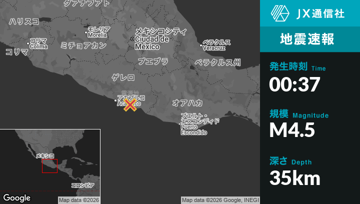 | 震源地 | メキシコのLas Vigasから北北西5kmの地点 |