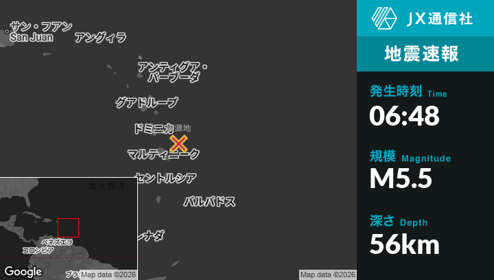 1月03日 06:48頃、マルティニークのSainte-Marieから北東58kmの地点でM5.5の地震がありました。