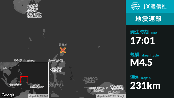 | 震源地 | インドネシアのTobeloから北北東119kmの地点 |