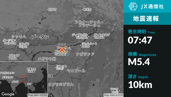 1月05日 07:47頃、インドのDhingから西3kmの地点でM5.4の地震がありました。