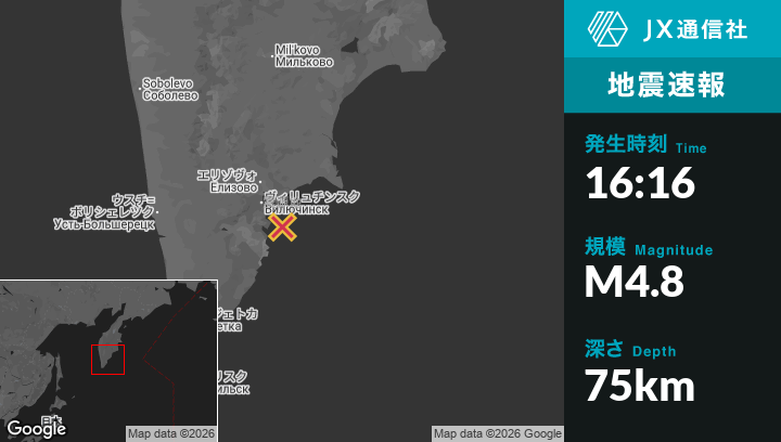 1月06日 16:16頃、ロシアのVilyuchinskから南東37kmの地点でM4.8の地震がありました。