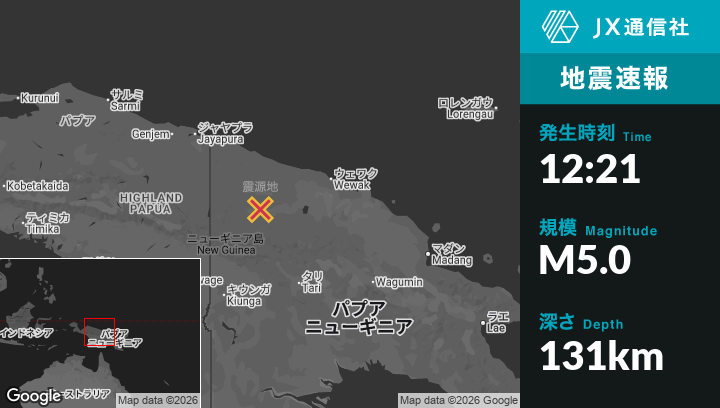 1月08日 12:21頃、パプアニューギニアのAmbuntiから西80kmの地点でM5.0の地震がありました。