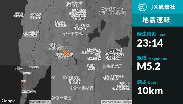 | 震源地 | アルゼンチンのSan Agustín de Valle Fértilから南71kmの地点 |