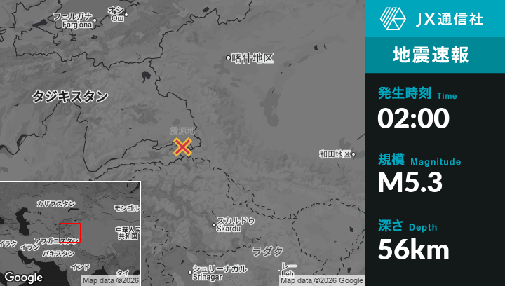1月09日 02:00頃、タジキスタンのMurghobから南南東101kmの地点でM5.3の地震がありました。