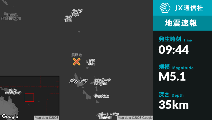 1月10日 09:44頃、バヌアツのSolaから西北西94kmの地点でM5.1の地震がありました。