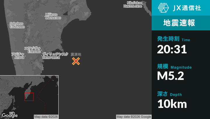 1月10日 20:31頃、ロシアのPetropavlovsk-Kamchatskyから東南東161kmの地点でM5.2の地震がありました。