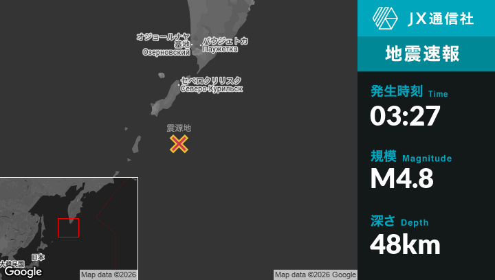 1月12日 03:27頃、ロシアのSevero-Kuril’skから南125kmの地点でM4.8の地震がありました。