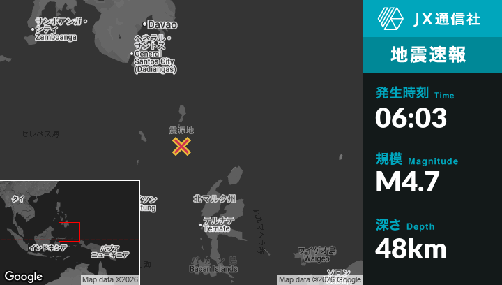 1月13日 06:03頃、インドネシアのTobeloから北西228kmの地点でM4.7の地震がありました。