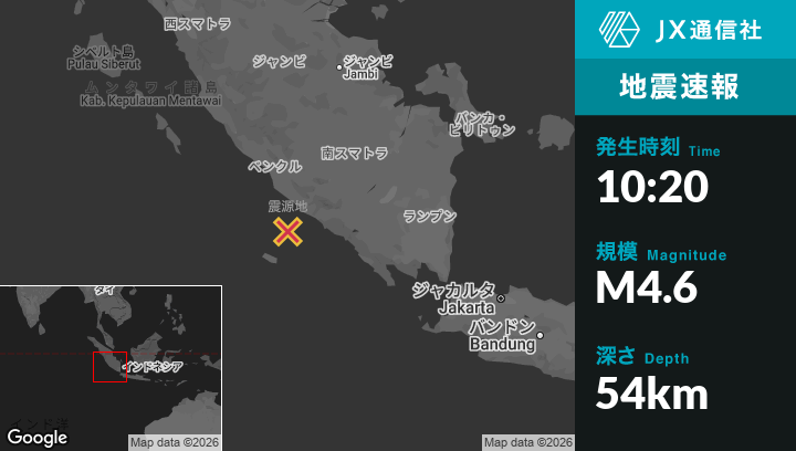 | 震源地 | インドネシアのPagar Alamから南西106kmの地点 |