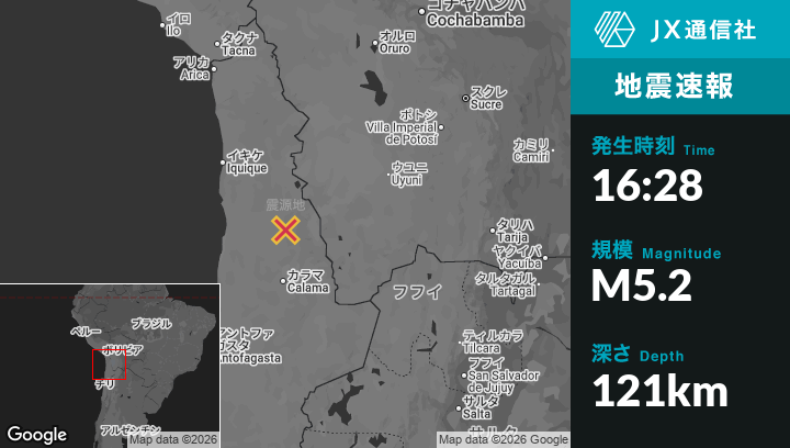 1月13日 16:28頃、チリのOllagüeから西南西68kmの地点でM5.2の地震がありました。