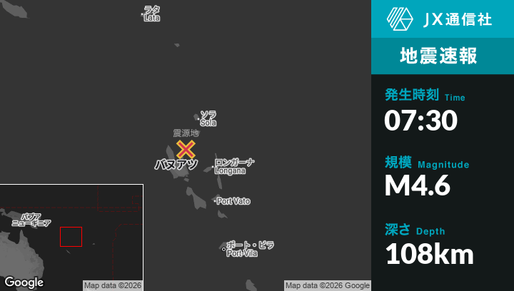 | 震源地 | バヌアツのPort-Olryから北42kmの地点 |
