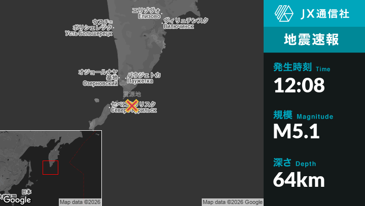1月14日 12:08頃、ロシアのSevero-Kuril’skから東68kmの地点でM5.1の地震がありました。