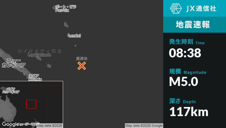 1月15日 08:38頃、バヌアツのIsangelから南南東228kmの地点でM5.0の地震がありました。