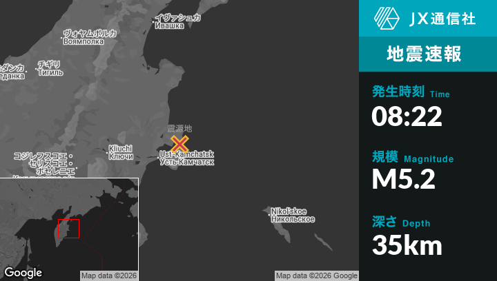 1月17日 08:22頃、ロシアのUst’-Kamchatsk Staryyから北東53kmの地点でM5.2の地震がありました。