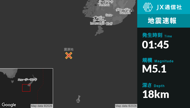 1月19日 01:45頃、ニュージーランドのBluffから南西297kmの地点でM5.1の地震がありました。