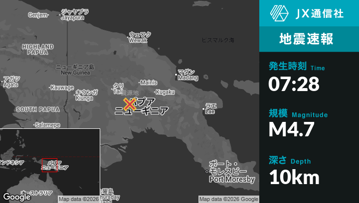1月20日 07:28頃、パプアニューギニアのMendiから南南東28kmの地点でM4.7の地震がありました。