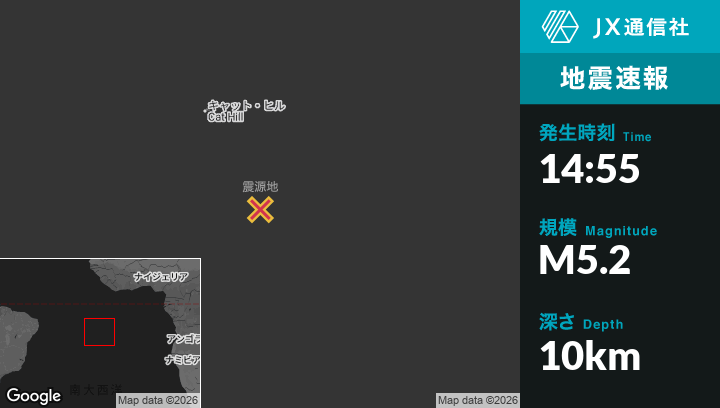 1月20日 14:55頃、セントヘレナのGeorgetownから南南東261kmの地点でM5.2の地震がありました。