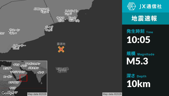 1月21日 10:05頃、イエメンのQalansīyahから北196kmの地点でM5.3の地震がありました。
