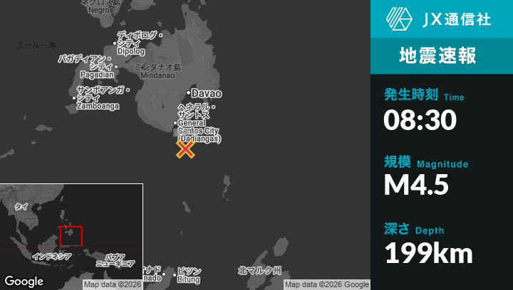 1月24日 08:30頃、フィリピンのSaranganiから北東7kmの地点でM4.5の地震がありました。