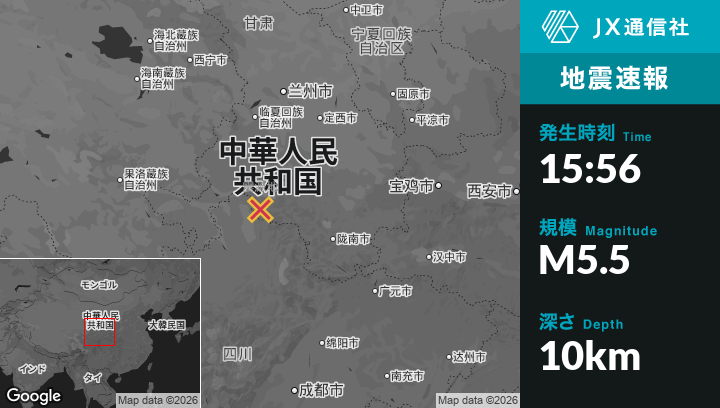 1月26日 15:56頃、中国のDiangaから東南東9kmの地点でM5.5の地震がありました。