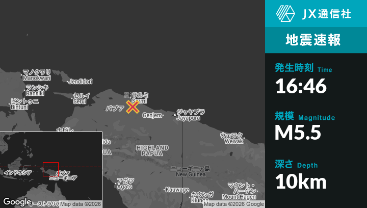 2月24日 16:46頃、インドネシアのAbepuraから西北西205kmの地点でM5.5の地震がありました。