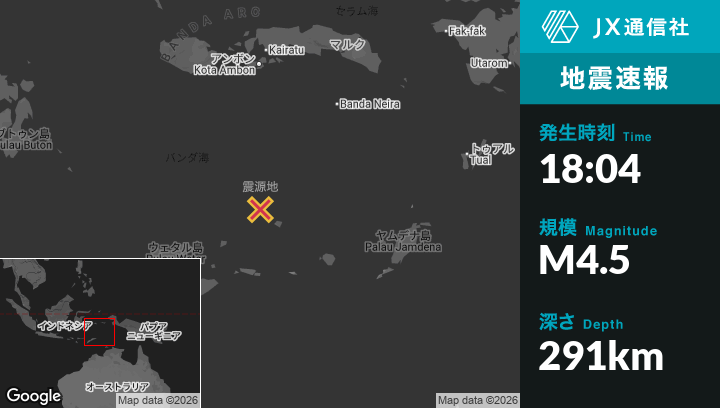 2月25日 18:04頃、東ティモールのLospalosから北北東239kmの地点でM4.5の地震がありました。