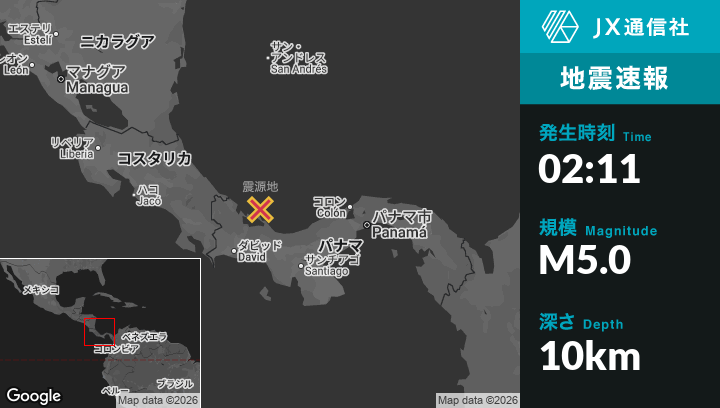 3月01日 02:11頃、パナマのKusapínから北26kmの地点でM5.0の地震がありました。